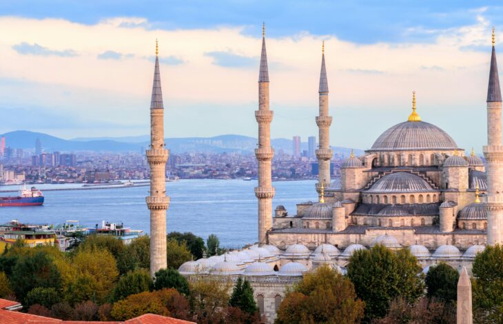 Often referred to as the Blue Mosque, the interior of the building is adorned with over 21,000 hand-crafted İznik tiles, predominantly in shades of blue, featuring intricate floral and geometric patterns. The mosque’s layout includes a vast courtyard surrounded by arcades, a richly decorated prayer hall, and an imposing central dome supported by four massive pillars. Its cascading domes and six minarets make for a stunning silhouette, deliberately designed to rival the neighboring Hagia Sophia in grandeur.